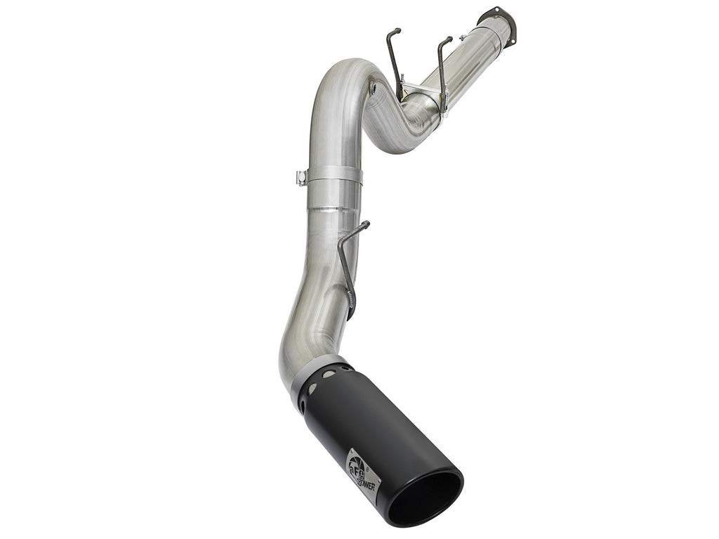 Finishing off the exhaust is a 6" diameter, black, stainless steel slash cut tip with intercooling vents designed to reduce exhaust gas temperatures at the tailpipe. A unique stainless steel laser-cut aFe Power logo plate is riveted on for an aggressive style.