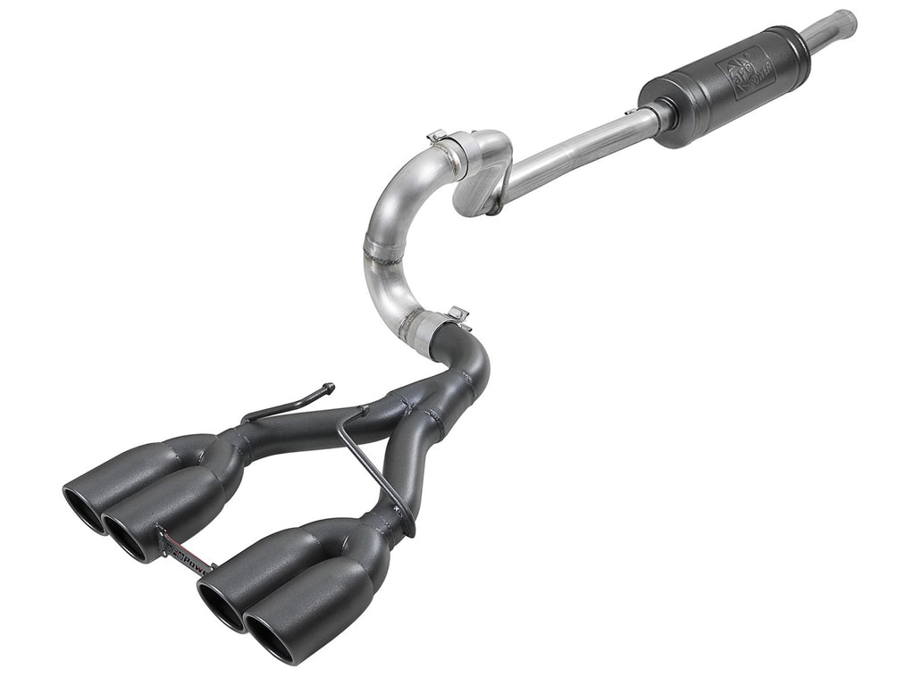 Unique sound and style is what this Rebel Series cat-back exhaust system delivers. 2 1/2" mandrel bent, 304 stainless steel tubing is 100% hand MIG-welded for race proven strength and durability. A high flow stainless steel, metallic black powder coated muffler delivers a powerful exhaust tone. The system uses factory mounting locations for an easy install that stays put under any driving condition. Finished with rear exit, quad 3 ½” diameter, black stainless steel tips with our signature laser-cut aFe POWER badge for a unique, custom-styled look.