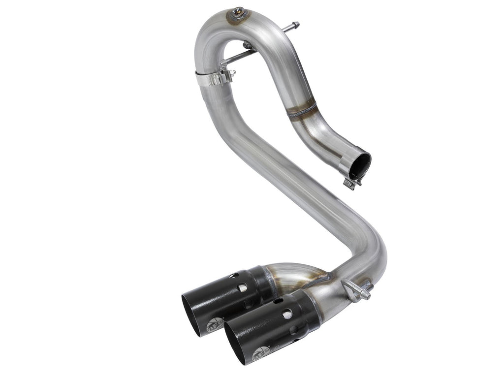 Finishing off this exhaust are dual 3-1/2" diameter, black, stainless steel tips with intercooling vents designed to reduce exhaust gas temperatures at the tailpipe. A unique stainless steel laser-cut aFe Power logo plate is riveted on for an aggressive style.
